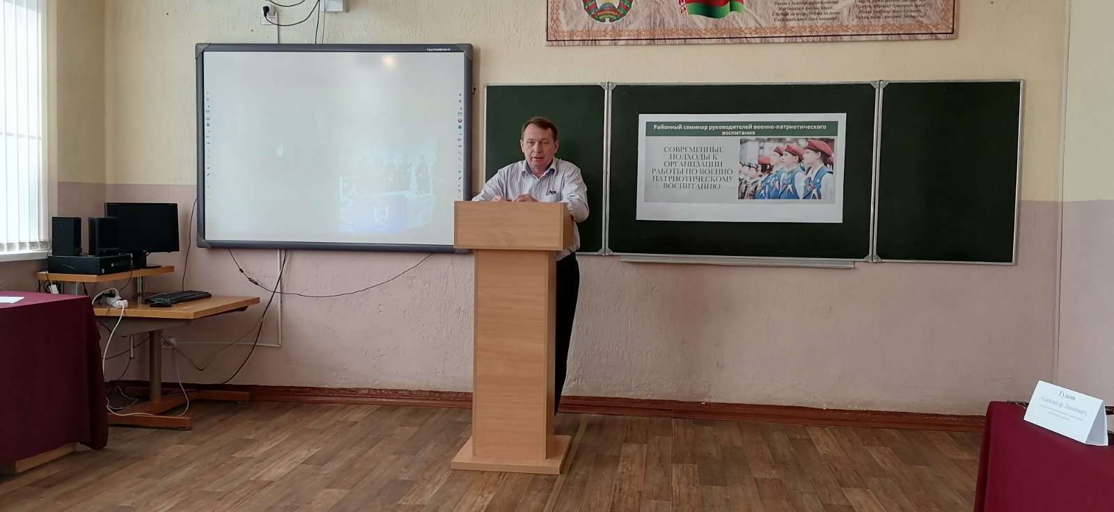 На базе средней школы № 5 г. Жлобина прошёл семинар руководителей военно-патриотического воспитания. Спикерами выступили ведущий специалист военного комиссариата Жлобинского района Александр Гудков, начальник центра допризывной подготовки Ольга Чернецова, председатель районной организации Белорусского союза офицеров Алексей Щербаков, главный специалист отдела образования райисполкома Наталья Сергеева. Открыла мероприятие Наталья Петровна, которая отметила значимость повышения уровня знаний о современных направлениях военно-патриотического воспитания молодёжи. Присутствующие на семинаре говорили о важности популяризации военной службы, роли военно-патриотических классов в становлении личности учащихся, делились опытом работы и многое другое. Не обошлось и без приятных моментов — руководитель по военно-патриотическому воспитанию СШ № 5 Сергей Ковалёв за личный вклад в дело патриотического и нравственного воспитания граждан, подготовку молодёжи к службе в Вооружённых Силах, поступлению в высшие военные учебные заведения Республики Беларусь был награждён грамотой Вооружённых Сил Республики Беларусь.