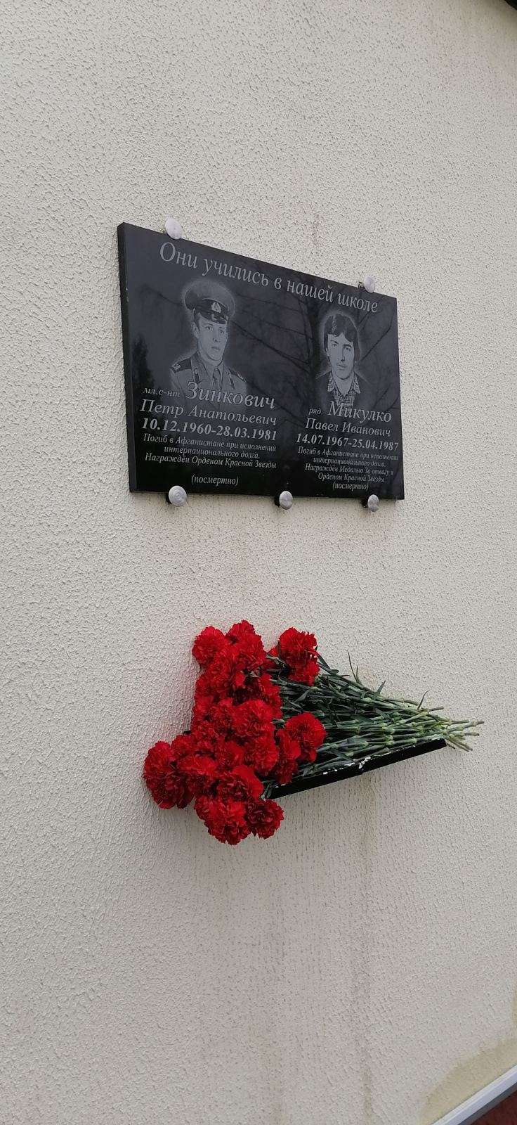 Мы начали с того, что возложили цветы к мемориальной табличке. Там увековечены имена выпускников школы — Петра Зинковича и Павла Микулко, отдавших жизни в Афганистане.